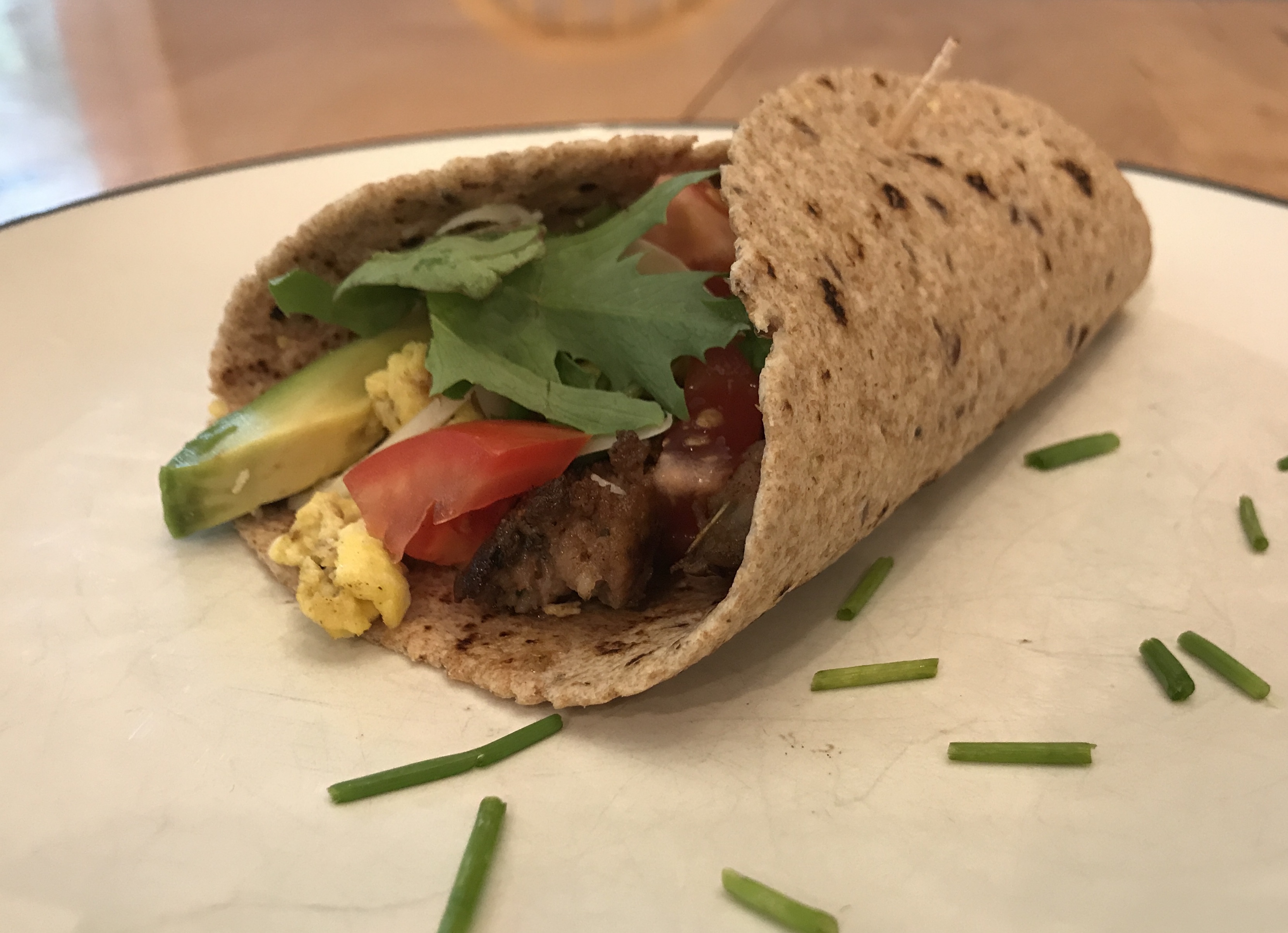 We used to make breakfast burritos all the time. At some point we fell for the marketing gimmicks and used to think that somehow those fake sausage soy crumbles were good for us or the factory pork sausages, so we’d use those. Now of course we realize that was a bad idea for a million reasons.