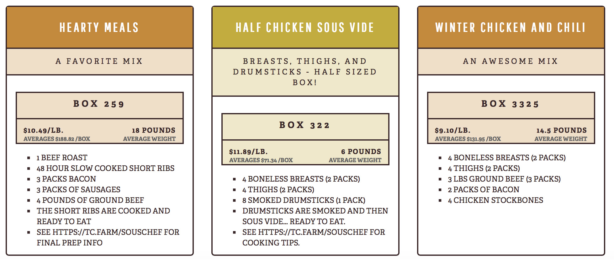 Everything you need to make some of your favorite dishes.  Comes with boneless breasts, chicken thighs, some ground beef, some bacon and some stock bones.  We call it Winter Chicken and Chili but we'd love to hear some things that other people make from it!!
