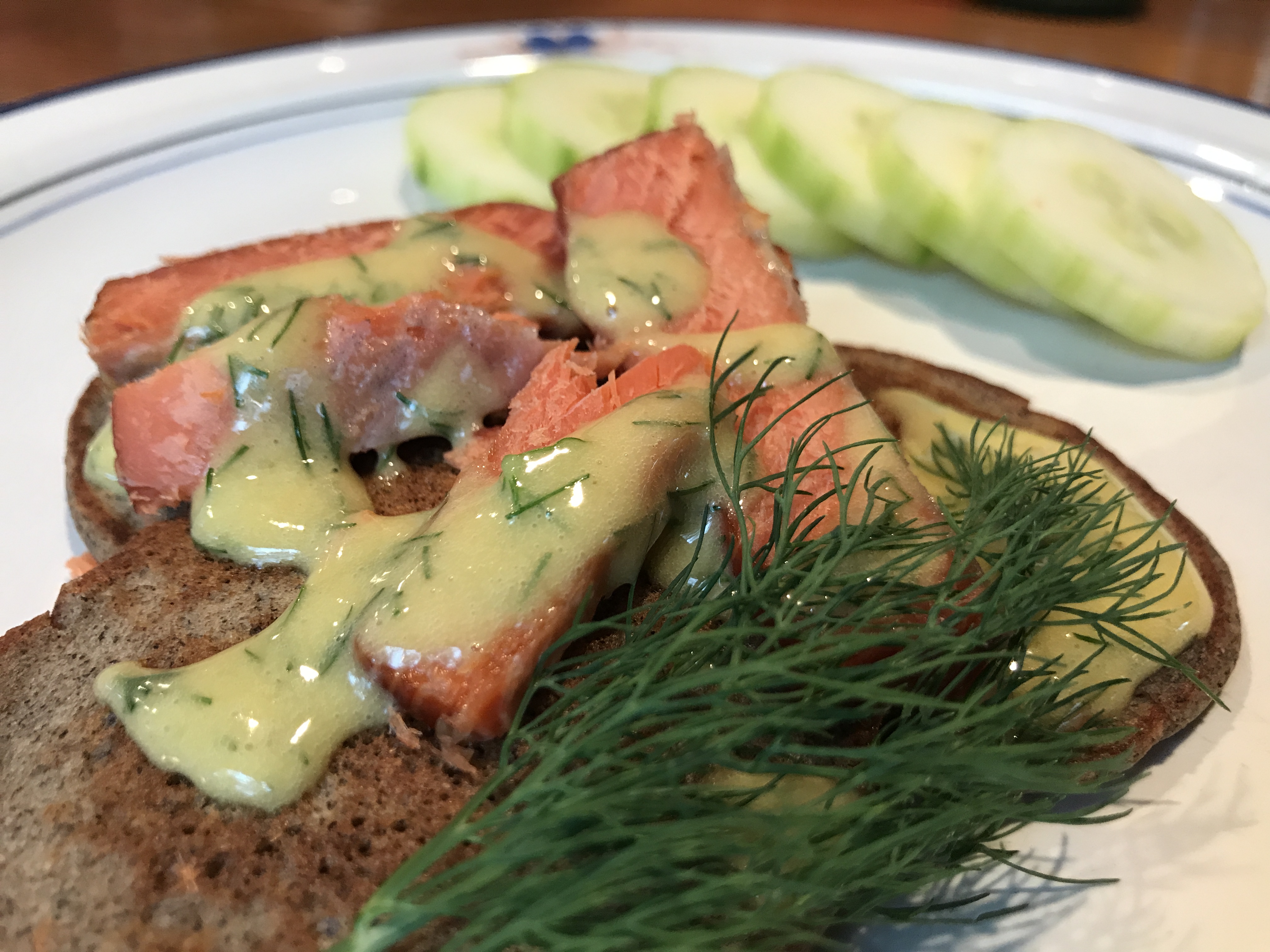 Serve pancakes topped with flaked salmon, chopped cucumber, and mustard-dill sauce.