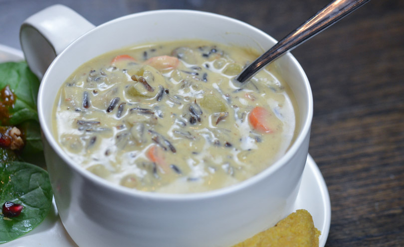 Local MN Wild Rice, Scratch-made Veggie Stock, Organic Valley Cream, Onions, Mushrooms, Carrots, Celery, Butter, Garlic, Almonds, Brown Rice Flour, Curry Powder, Parsley, Pepper, Salt