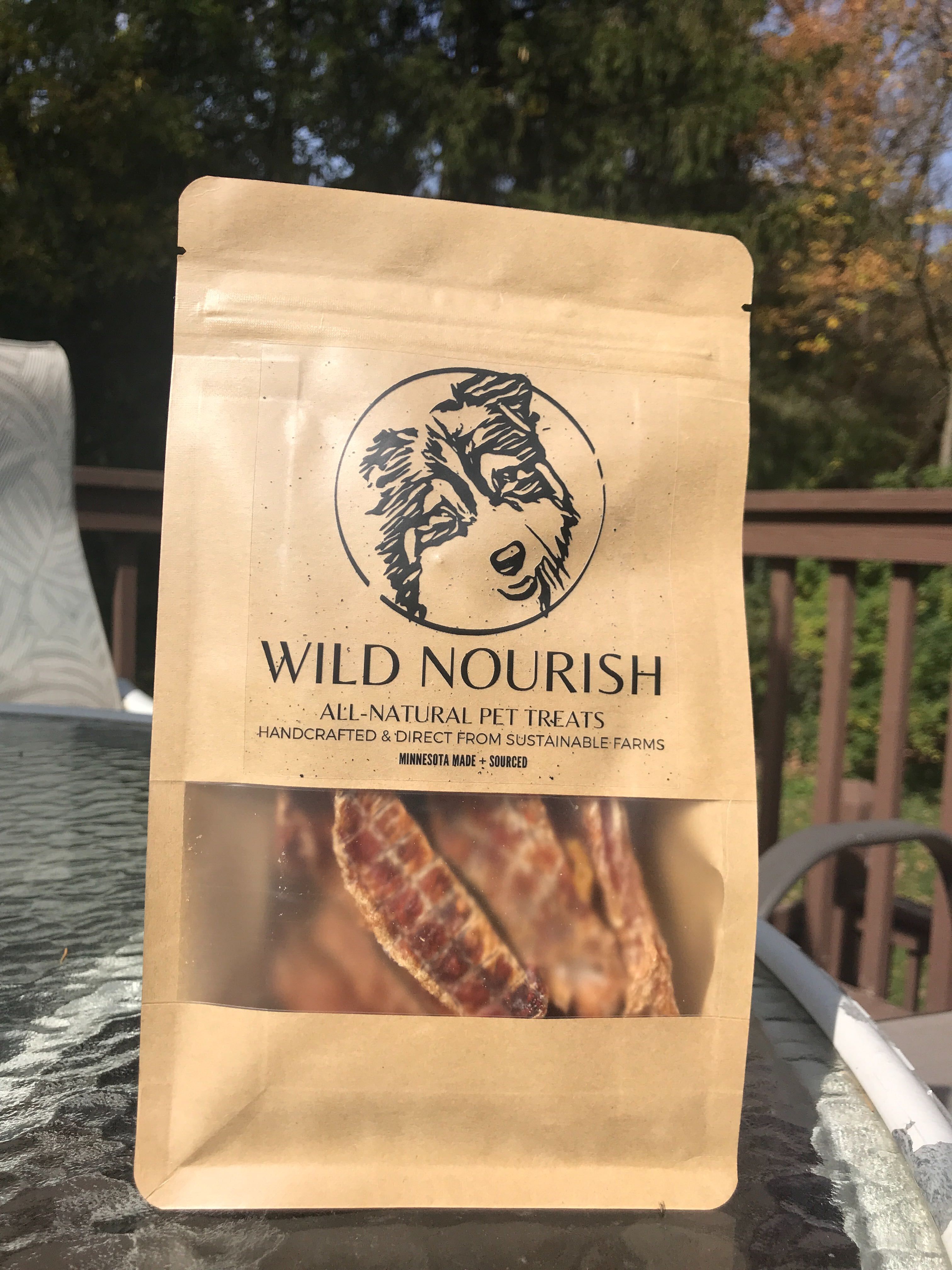 Wild Nourish all-natural pet treats are handcrafted in small batches. Hand trimmed and sliced, air-dried chicken breast strips made in Waconia. A lean and protein-rich treat for all pets. From TC Farm chicken, so you know it was truly pasture raised. Made with a single ingredient - no antibiotics, hormones or additives.