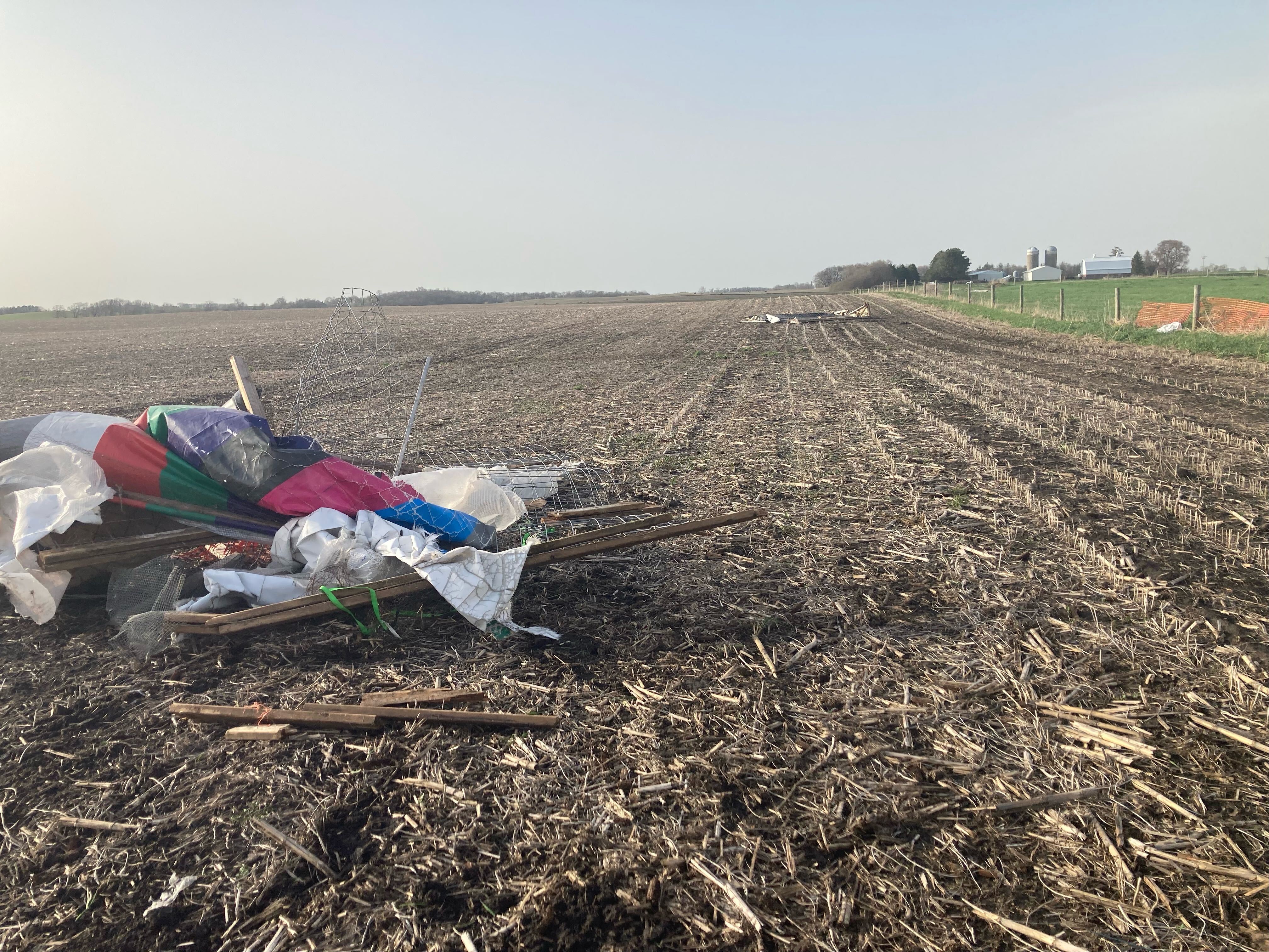 Above, you can see the remains of coops that blew off their property. It was hard to capture it all in one picture because they blew so far from each other.